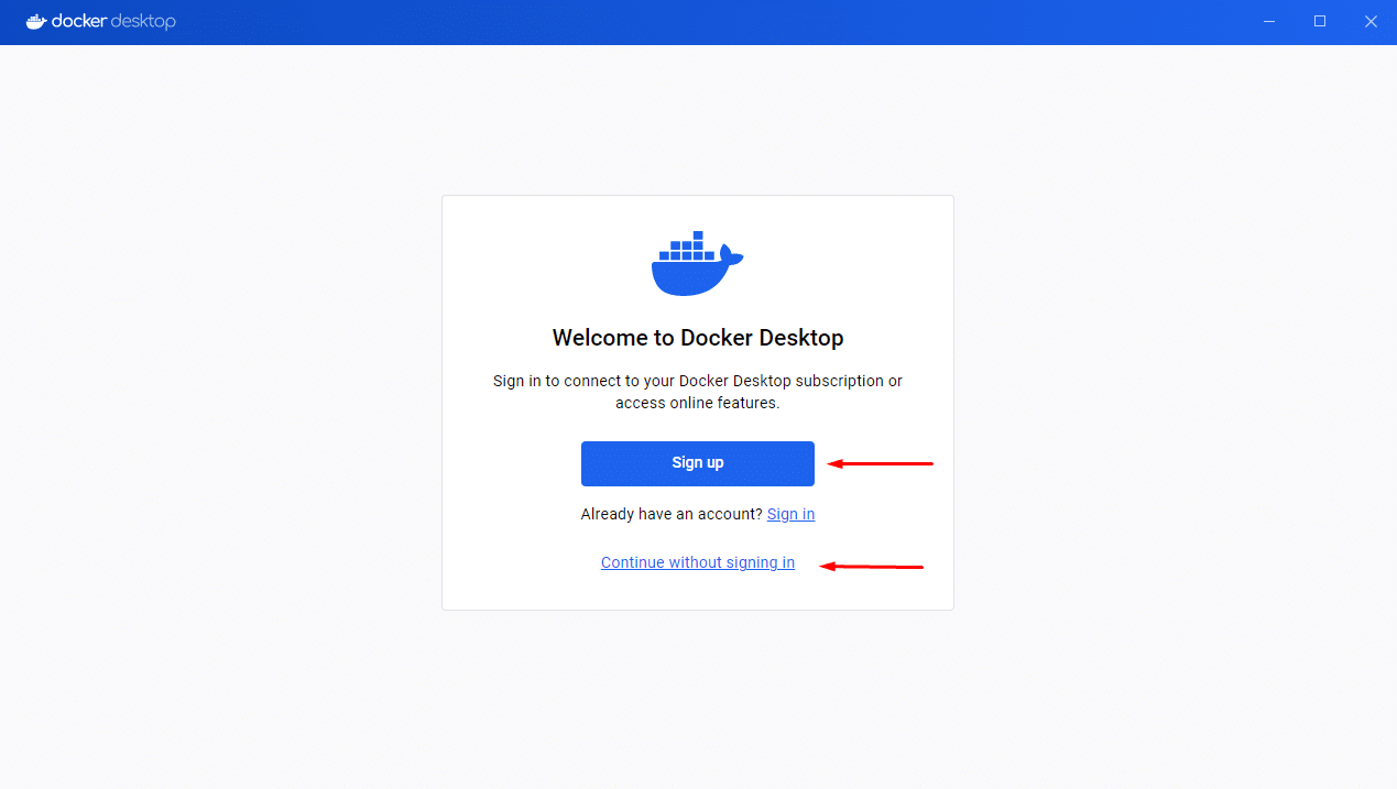 - Open Docker Desktop. You will be given the option to set up an account or to continue without signing in. We won’t cover the sign up process since it’s self-explanatory, but either way works.