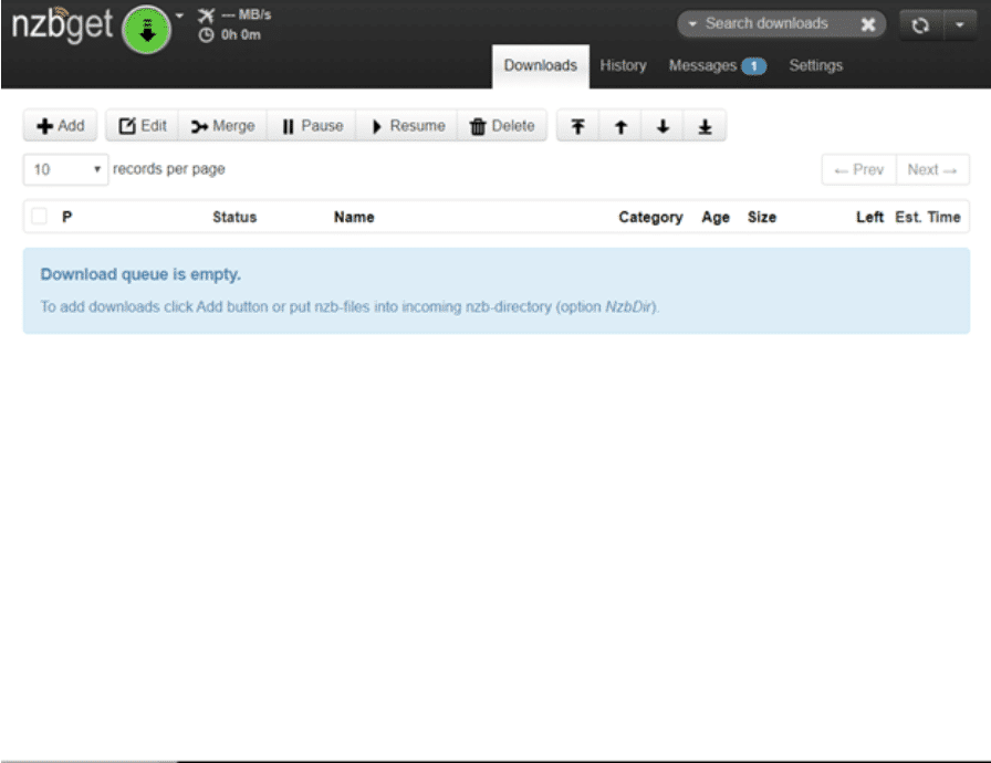 The first time you launch NZBGet, you’ll see the main NZBGet screen: