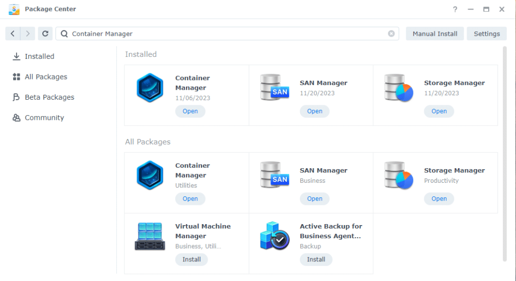 - Search for “Container Manager,” choose it, and click “Install.”