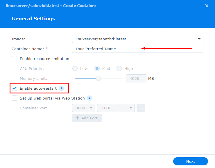- You can modify the container name (optional). We recommend enabling “Auto-restart” for the container to self-recover in case of crashes. Click “Next.”