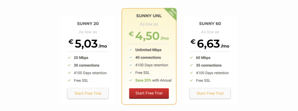 How much does Sunny Usenet cost?Plans start at €3.03/month for Sunny 20. The unlimited speed Sunny UNL plan costs €6.23/month when billed annually.